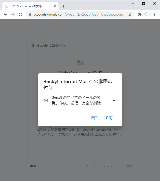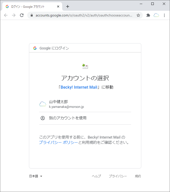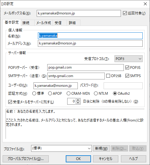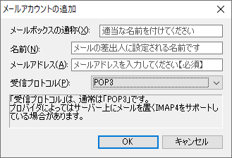 Gmailのメールサーバーを利用する場合は以下のように入力し【OK】を押してください。
