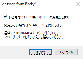 「POP3S」へチェックをする際に以下のダイアログが表示されますので【はい】をクリックして下さい。
